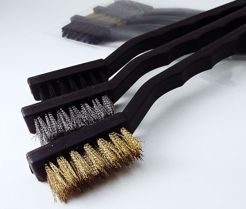 Estos pequeños cepillos de cerdas duras son utilizados para abrir o separar fibras sintéticas o naturales, sean pelos o plumas, atadas sobre la pata del anzuelo o logradas con técnica de dubbing loop. El set incluye tres cepillos, uno de cerda de nylon rígido (cepillo de dureza suave), otro de cerdas de bronce (cepillo de dureza intermedia) y por ultimo el de cerdas de metal (cepillo de dureza extrema) para cada tipo de mosca o técnica de atado un cepillo a su medida.